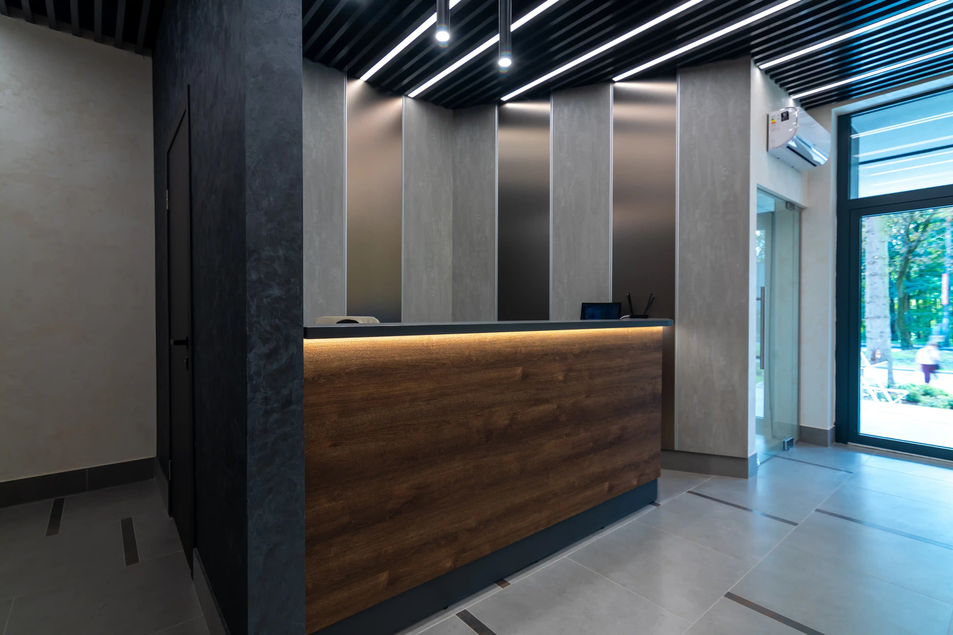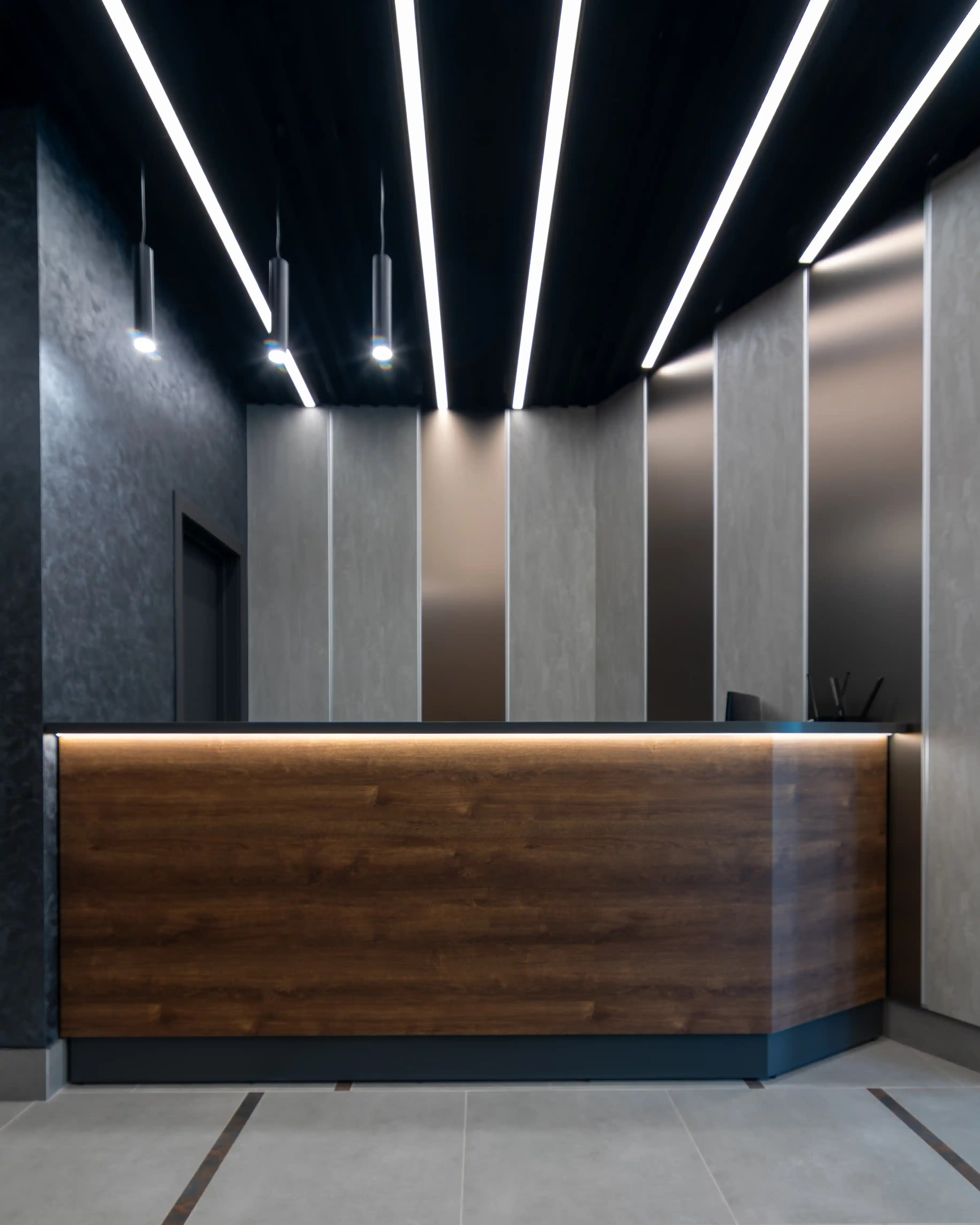 The interior of this area is designed to create a feeling of comfort and trust in the space from the very first seconds. The façade is made of Kronospan oak expressive bronze chipboard, whose natural texture is aptly emphasised by recessed LED lighting. The light delicately envelops the lines of the furniture, adding depth and a modern character to the interior. The upper part and accent elements of the area are made of Kronospan chipboard in anthracite. The contrast between the dark surfaces and the warm wood texture creates a restrained look that fits harmoniously into the overall concept of the space. This project demonstrates how well-thought-out furniture solutions combine comfort and aesthetics, becoming an important component of the first impression.