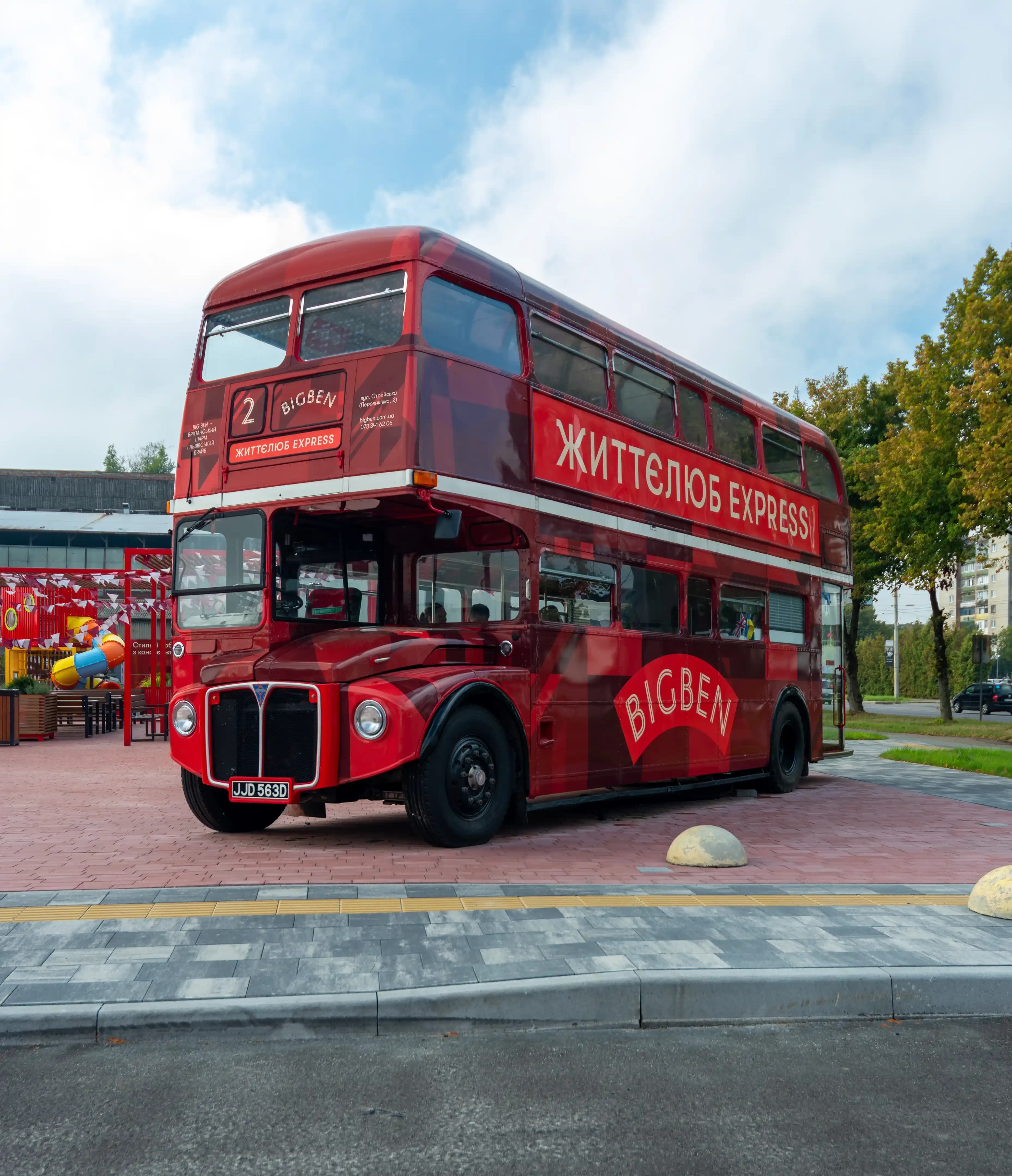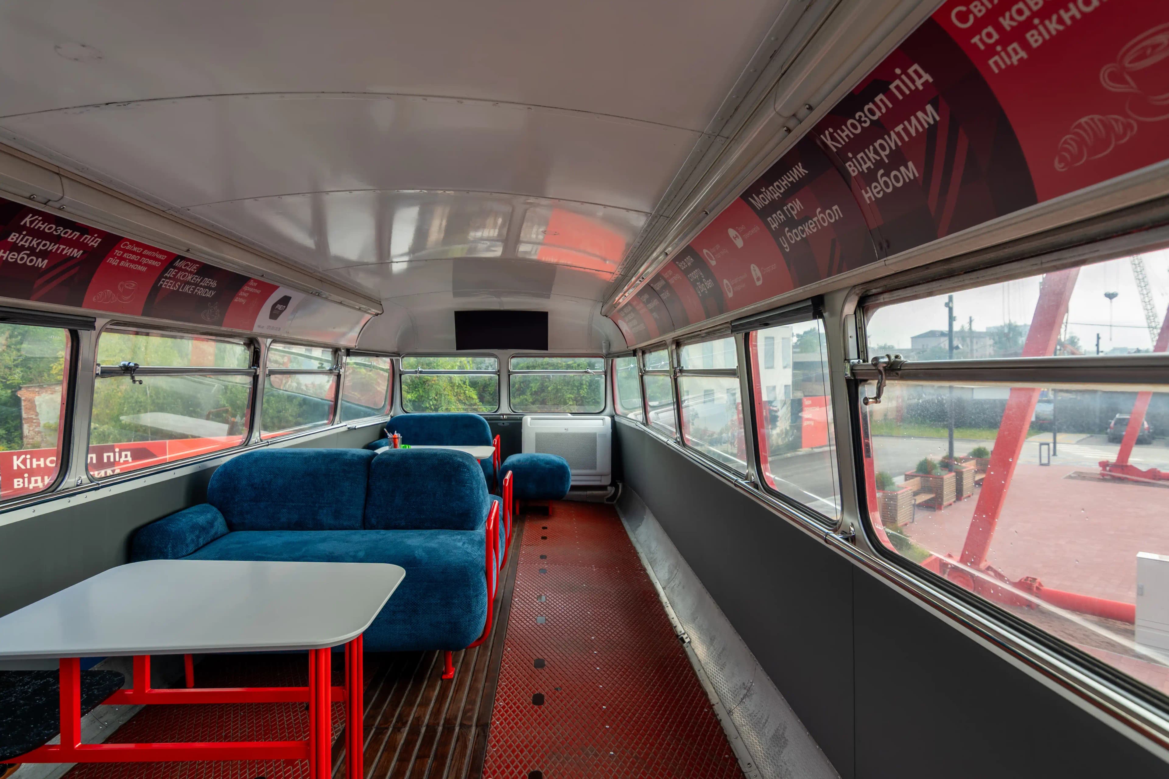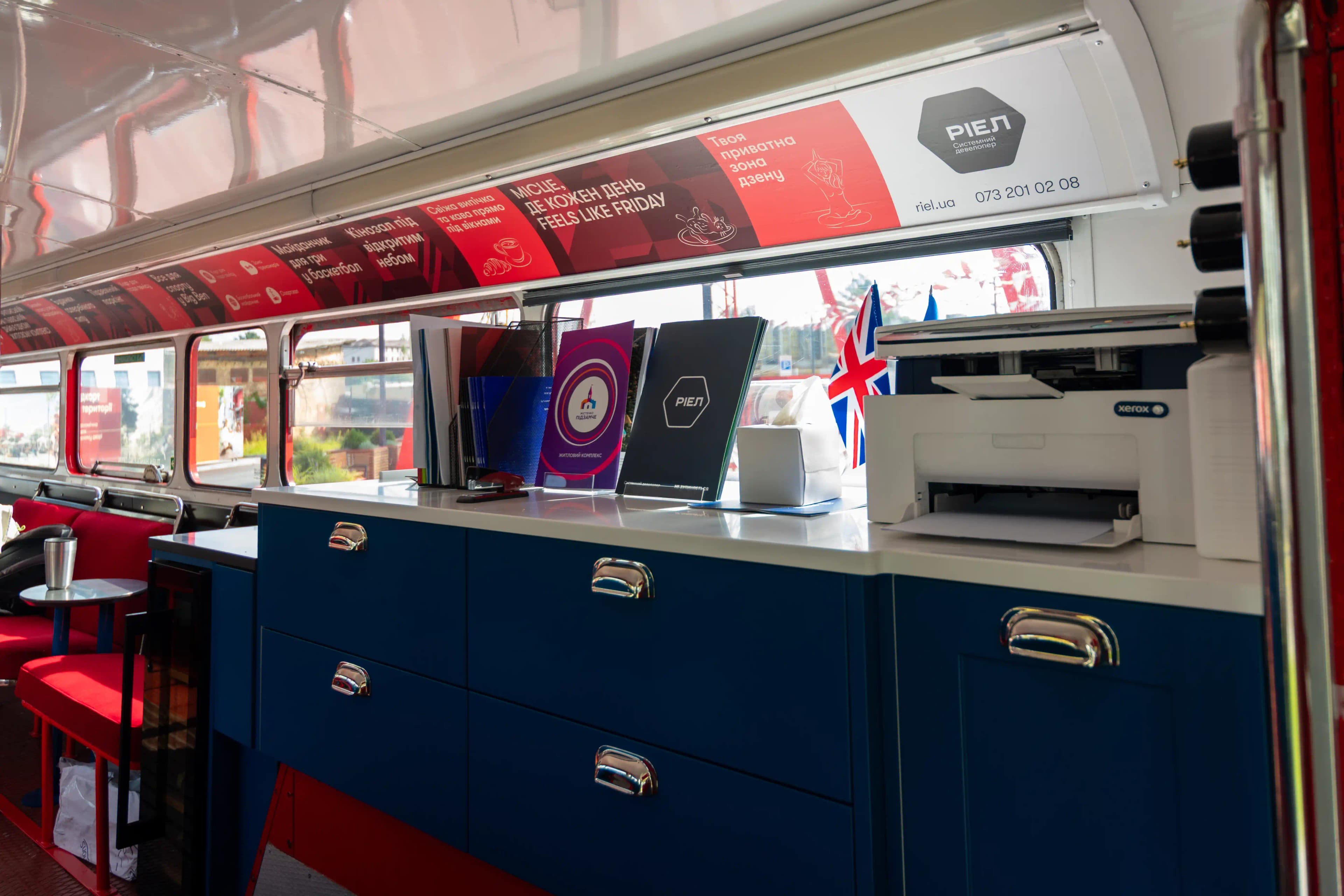 Individual design, well-thought-out functional solutions and bright accents - this is all about the implementation of the sales department project for the BIG BEN residential complex. It became the final stage of the creative concept of space and an important part of brand communication with customers. One of the key elements of the interior was a non-standard kitchen section integrated into the space of a two-storey British bus (double-decker). The lower section is designed as a fully functional kitchen unit: we installed a set of pull-out drawers, provided space for dishes, built-in appliances and waste sorters. The work surface is made of Grandex P-104 acrylic stone, and professional fittings and handles from Hafele were used to ensure the reliable operation of all moving parts. The space is complemented by tables in the brand's colours: blue and red with acrylic and quartz countertops. This combination adds dynamism to the interior and supports the overall concept. The project was implemented in collaboration with the Artprostir Design studio, which made it possible to achieve the integrity of the idea. This project demonstrates our approach to custom-made business furniture, as each element works for the brand, comfort and customer experience.